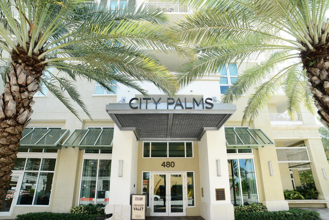 Soaring, floor-to-ceiling windows provide an airy atmosphere with gray and mint-green walls, tropical banana-leaf wallpaper and industrial ceiling. A fountain and bistro chairs grace a courtyard patio.